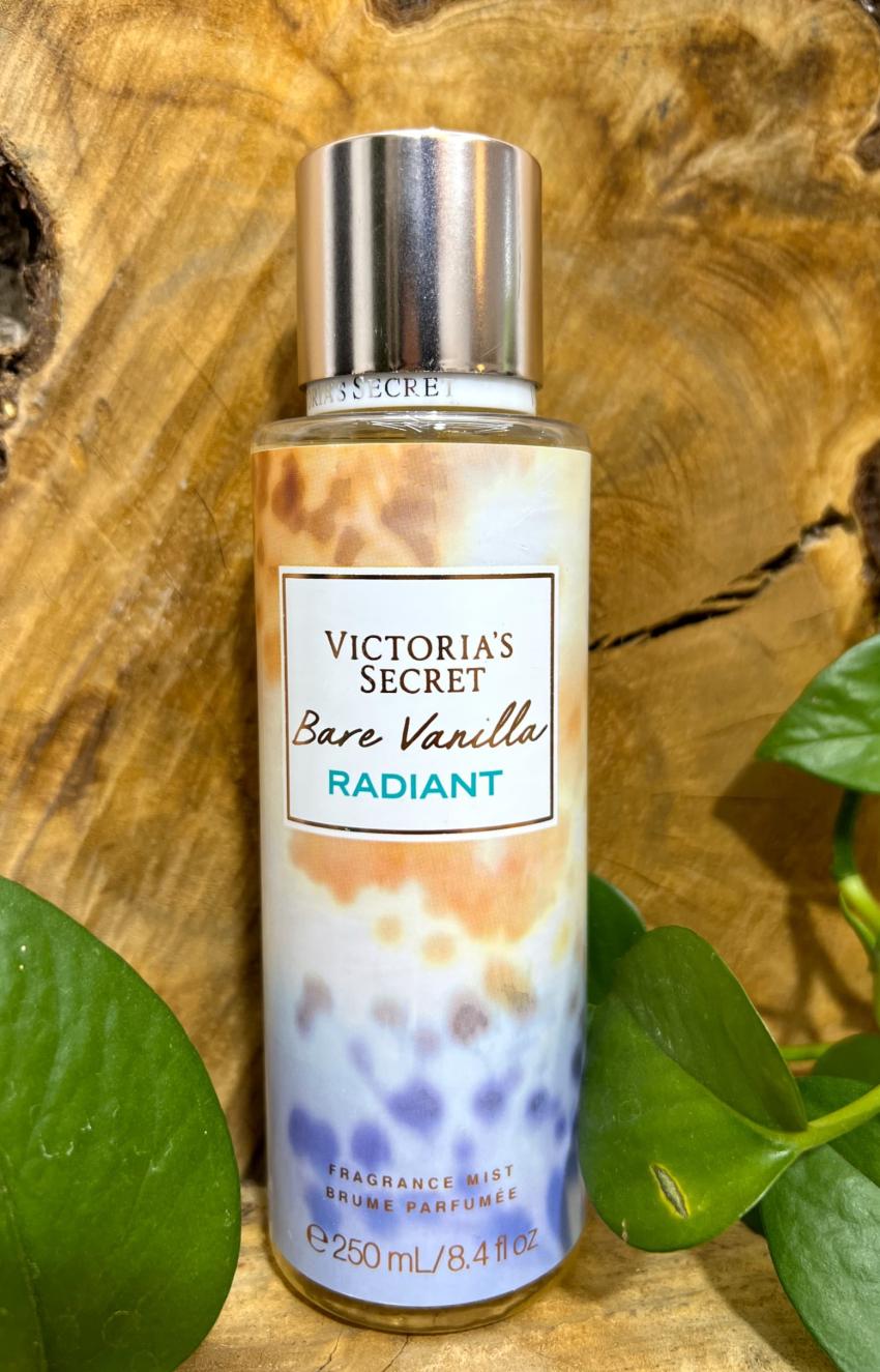 بادی اسپلش Bare Vanilla Radiant از ویکتوریا سکرت یک بادی میست (اسپری بدن) با رایحه میوهای، گلی و ملایم است. مشخصات و ویژگیها: حجم: 250 میلیلیتر (8.4 fl oz). رایحه: میوهای، شیرین و ملایم. نتهای اولیه: شامل پشنفروت (گل ساعتی) و توت قرمز. نوع محصول: اسپری بدن (Body Splash). کاربرد: قابل استفاده به عنوان عطر اصلی یا رایحه مکمل. ویژگیها: شادابکننده و طراوتبخش، دارای ماندگاری بالا، بافت سبک و بدون ایجاد چسبندگی بر روی پوست، عدم ایجاد لکه روی لباس. موارد استفاده: مناسب برای استفاده در باشگاه، منزل و مهمانیها.